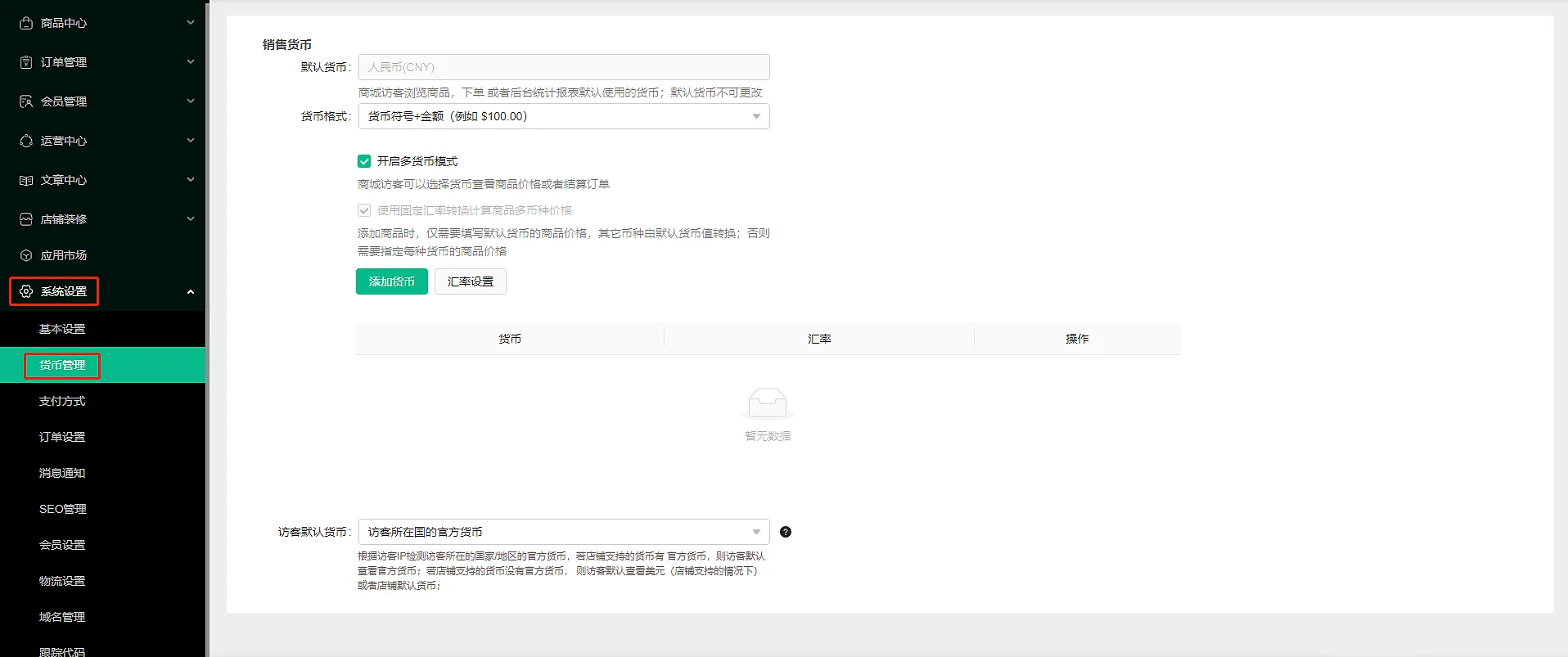 1.在后台「系统设置」中选择「货币管理」模块进入;