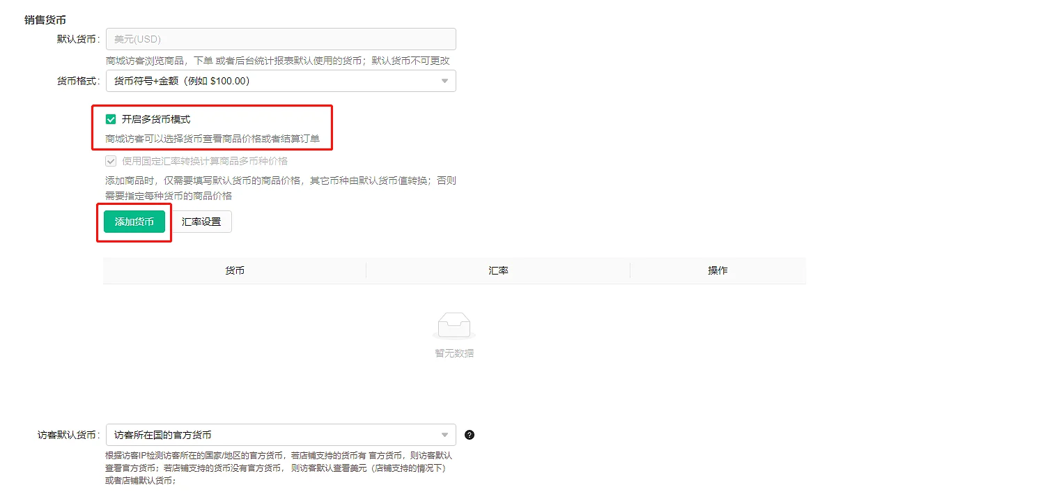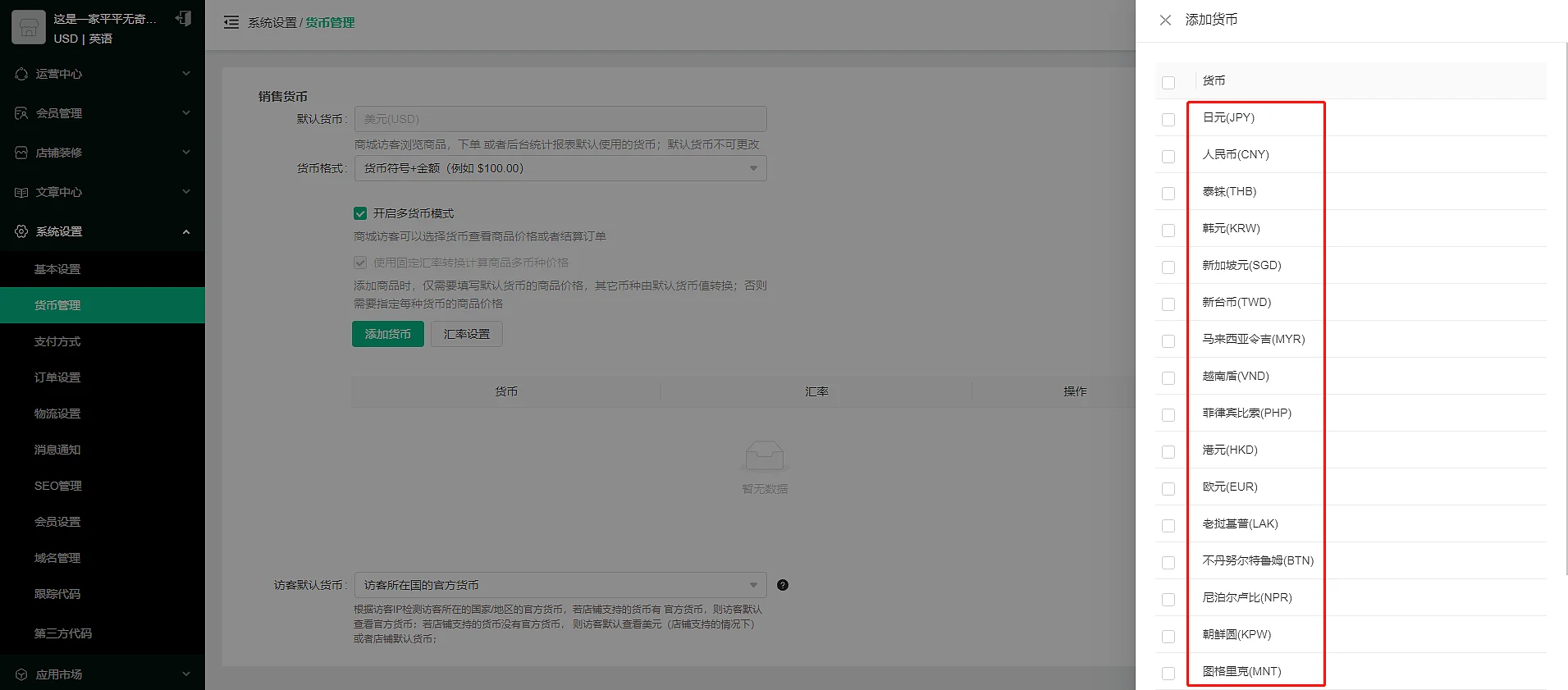 2.默认语言在创建店铺时设置后即被锁定,不可修改。商家可通过点击「开启多货币模式」>「添加货币」新增更多目标市场的货币。会员在前台则可以根据需要选择「货币列表」中的货币;