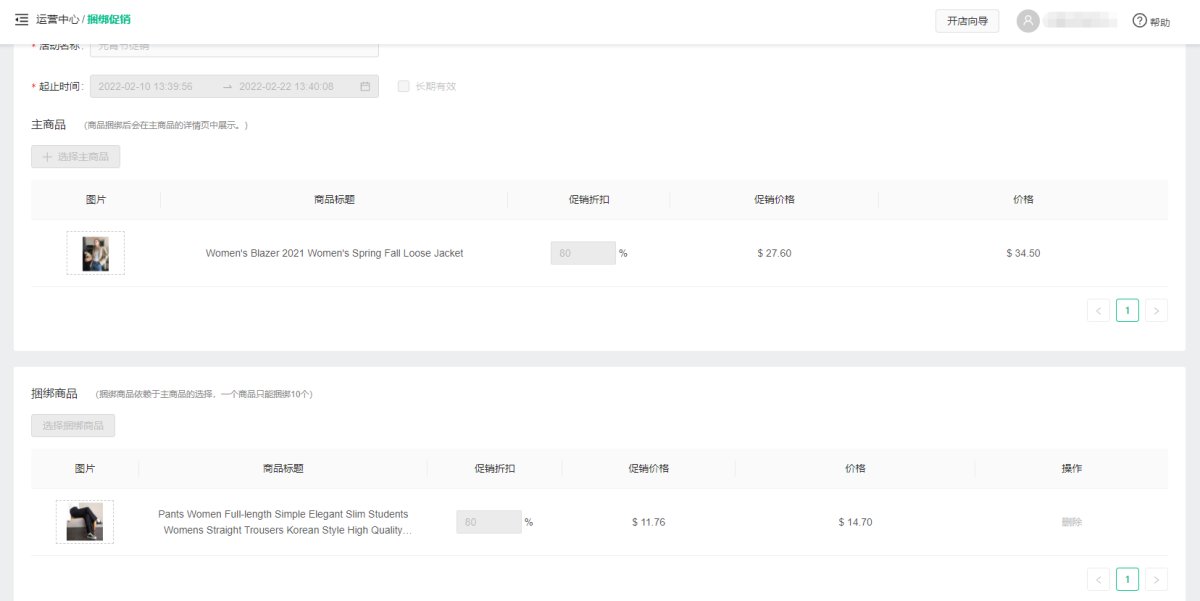 卖家可以进入店铺后在运营中心-捆绑促销中进行设置,在添加新的活动规则后,卖家可以详细设置活动名称、活动时间、适用商品范围等,同时商家需要在店铺装修-组件库-插件内,拖拽捆绑促销样式进行展示。