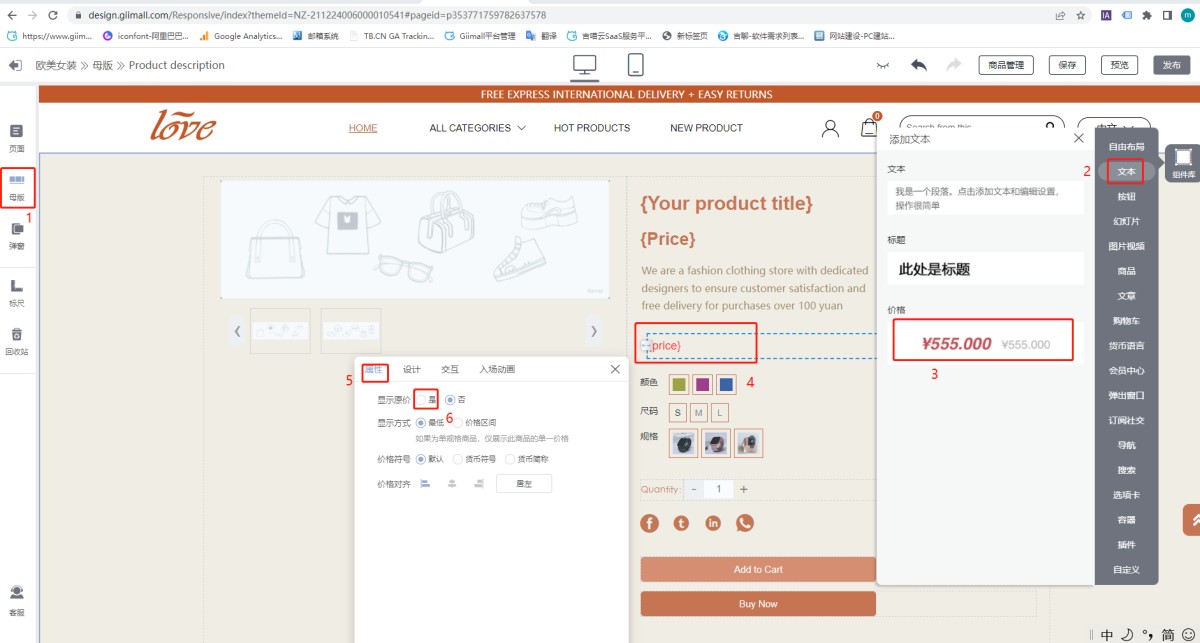 A2:响应式编辑页: 母版—组件库—文本—拖拽添加价格—属性—显示原价—是。