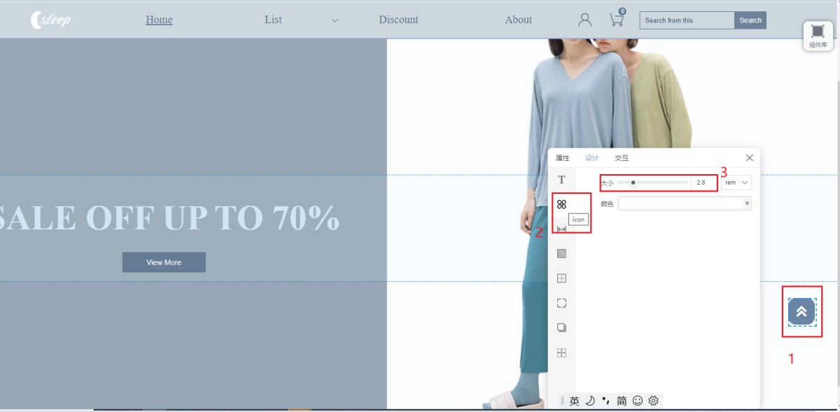 A:1)选中按钮组件,点击“设计”—“Icon”,调节大小。如图: