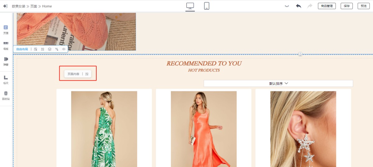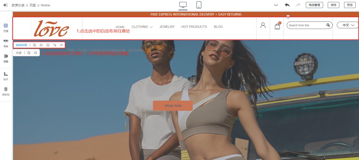 A:1.设置头部或底部的背景颜色:选中自由布局,点击自由布局任意处,会出现自由布局工具栏,点击工具栏打开设置面板。