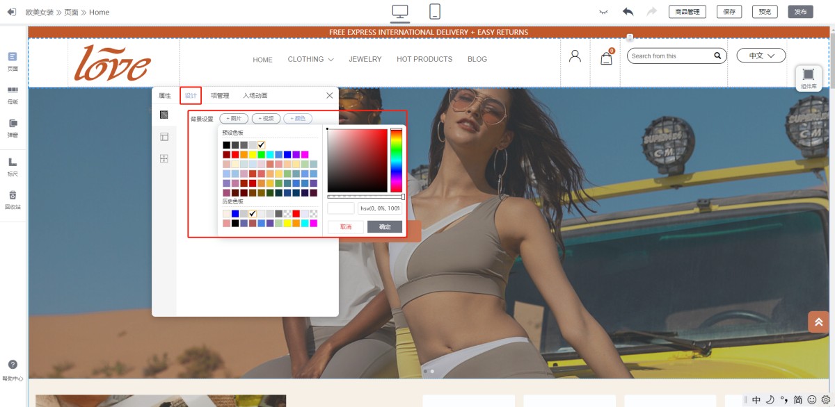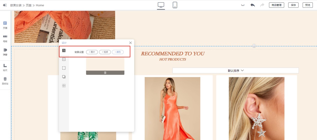 2.设置页面内容背景色:点击页面空白处,出现页面内容工具栏,打开页面内容设计面板,在背景设计中,添加或修改页面背景颜色。
