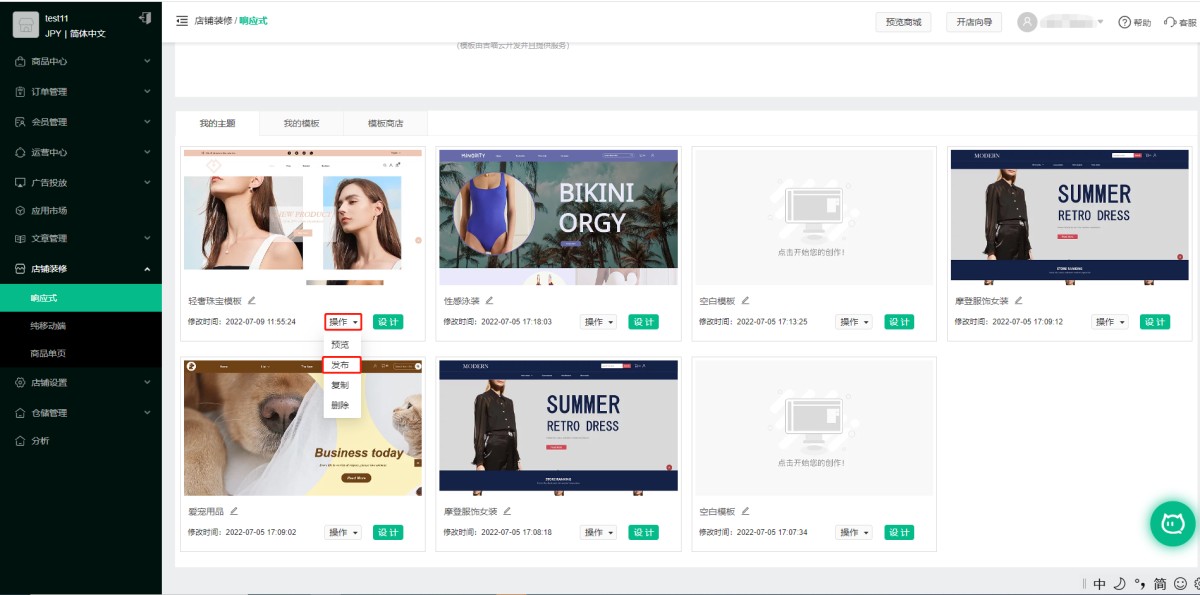 2. 如果您的店铺已经绑定了正式域名,点击“操作”—“发布“,这个主题就会上线成为当前店铺主题。