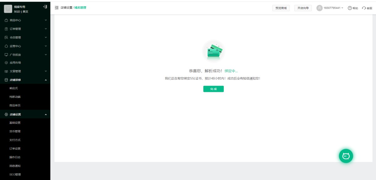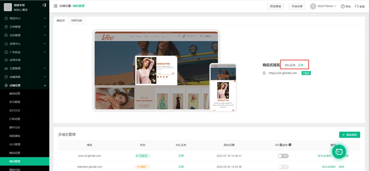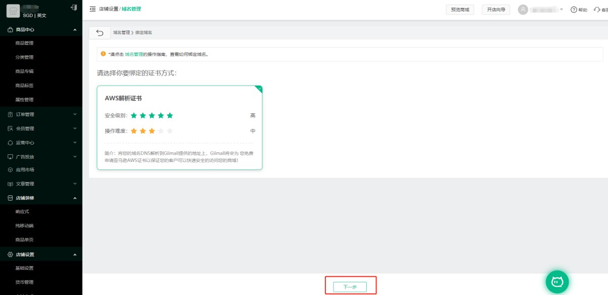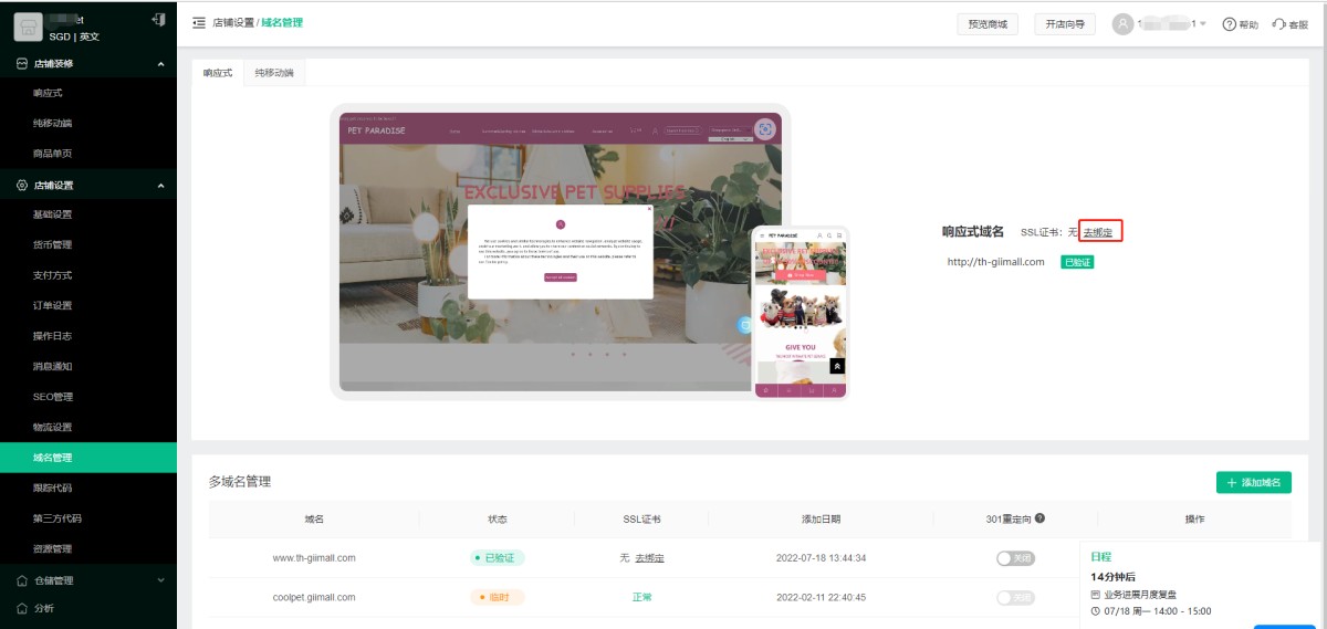 1. 在Giimall后台提供了免费的SSL证书,绑定了域名以后,点击“绑定证书”; 或在域名管理—SSL证书 无:点击 ”去绑定“。(域名绑定请参考域名绑定指南)