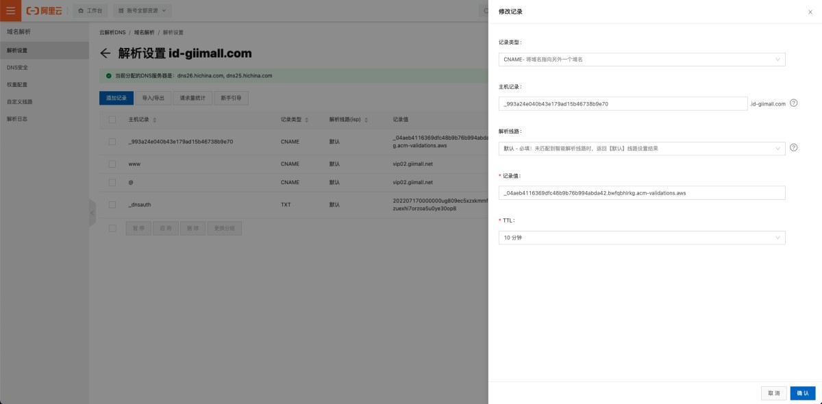 13.复制记录类型,主机记录和正确记录值到阿里云上进行DNS解析。