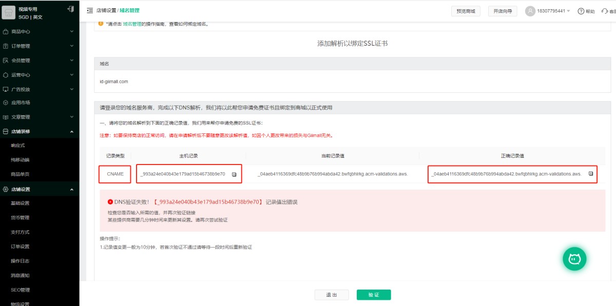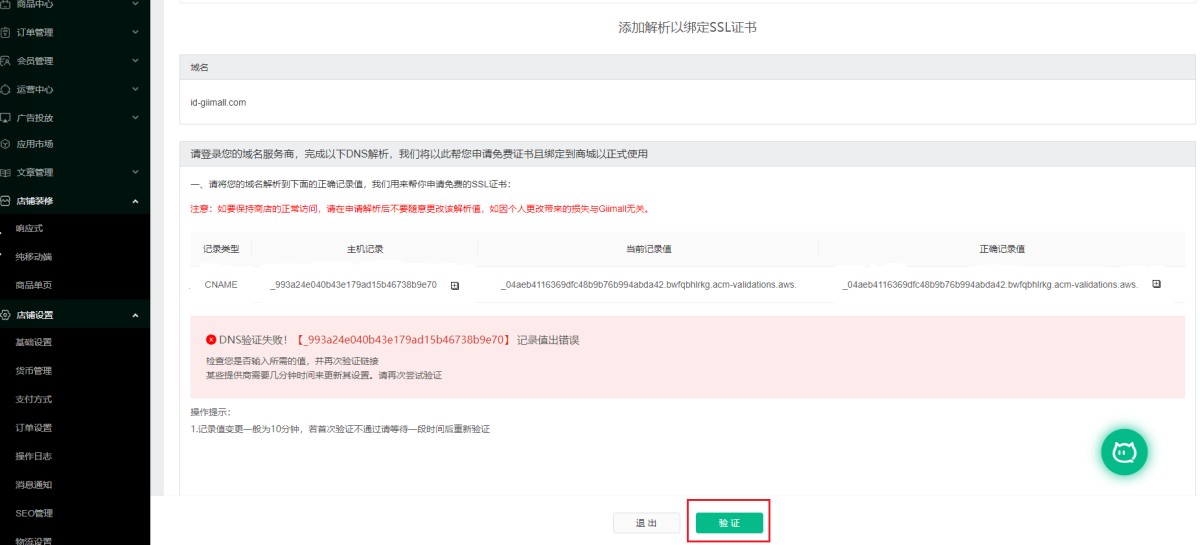 15. 回到Giimall后台,点击“验证”。可能需要等几分钟。