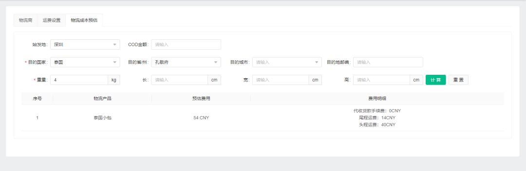 卖家可以根据目的地,货物重量,长,宽,高,COD金额等信息查询物流费用。