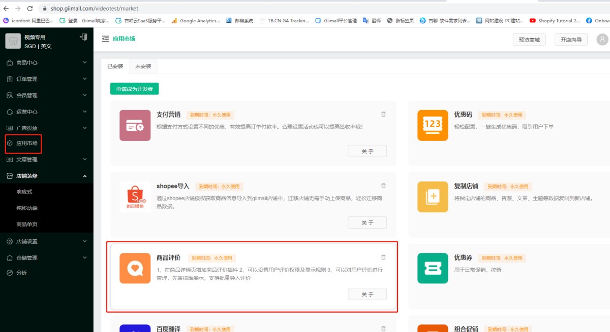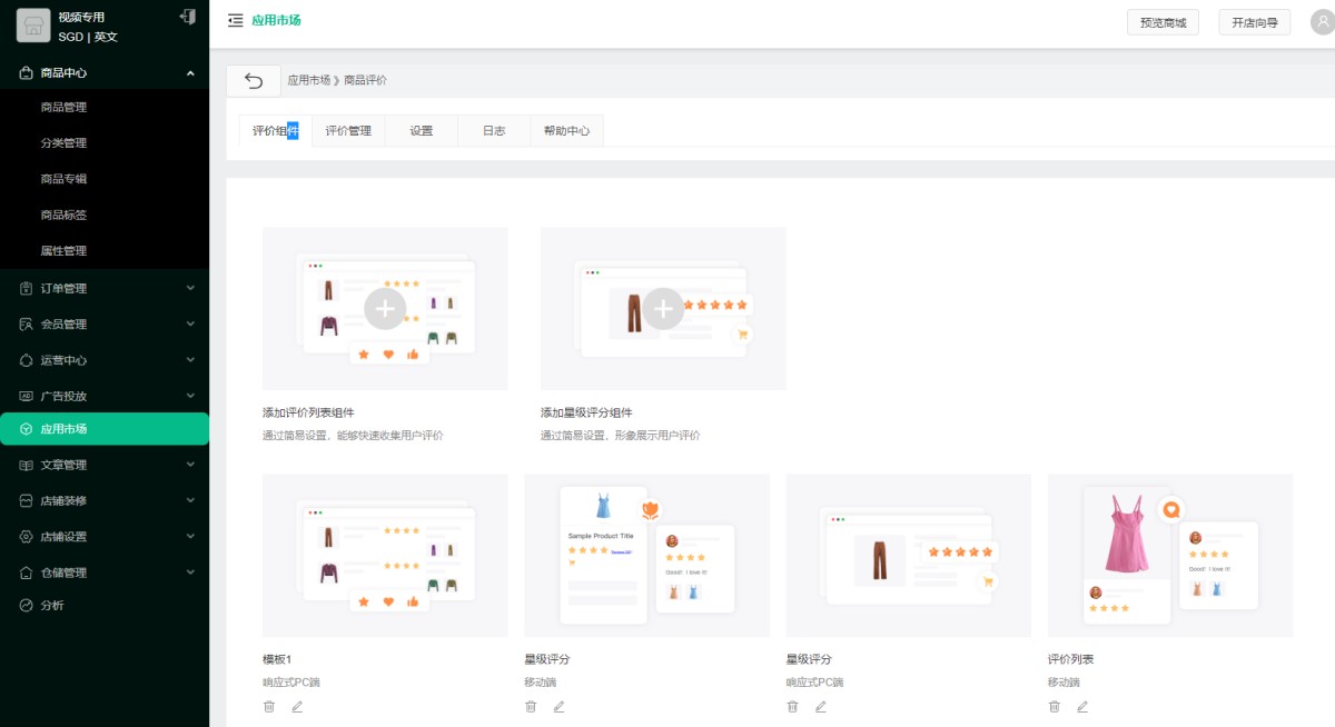 1. 在应用市场中购买并安装商品评价插件。