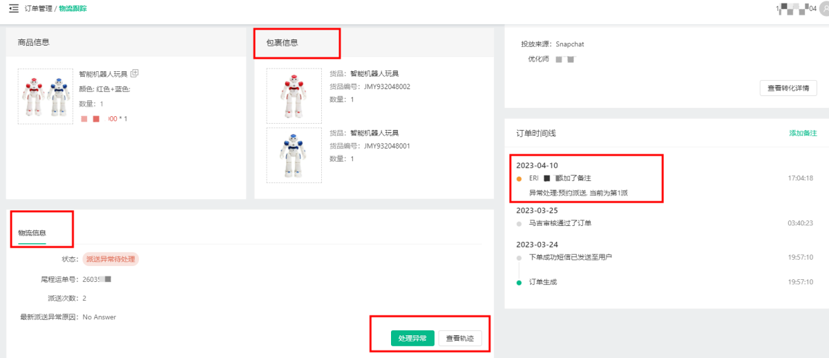 当订单中有促销赠品时,订单详情页新增的「包裹信息」显示可帮助卖家直观检查赠品是否打包在包裹内;物流信息版块「处理异常」则支持客服实时处理并记录预约派送、取消订单或联系不上等情况。