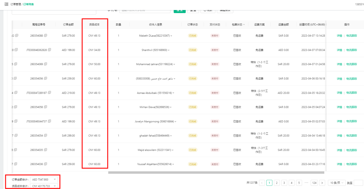 一般情况下,被拒签的包裹需要退回发货仓。而二次「转派」功能,支持把被拒签的包裹转派给同城新买家,旧订单无需退回仓库,新订单也不用重新打包发货,帮助卖家节省运费、减少库存,提高发货效率和签收率。选择「转派」功能时,符合条件的包裹(如派送3次都没成功)将自动显示,支持选择当前正在派送中的包裹发货。PART02 财务数据模块优化——多元展示 精准核算成本是综合考核的重要因素,不同市场情况,货品成本差异很大,如果没有数据统计,极易变成一本糊涂账。吉运ERP订单列表页新增「货品成本」字段及「货品成本合计」,帮助卖家合理制定成本控制策略。