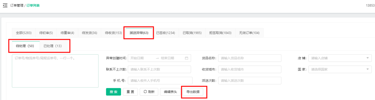 COD业务订单在派送中,可能会遇到各种异常情况。吉运ERP订单管理中,派送异常订单新增「待处理」/「已处理」列表,方便卖家集中处理异常订单。异常订单处理新增「导出数据」功能,导出数据时,可以选择字段、调整排序,方便卖家根据每个订单的情况进行处理。订单在派送时,会有各种原因导致客户派送失败,当客户因地址变动派送失败时,修改订单「收货地址」,重新派送,可以有效帮助提高签收率。