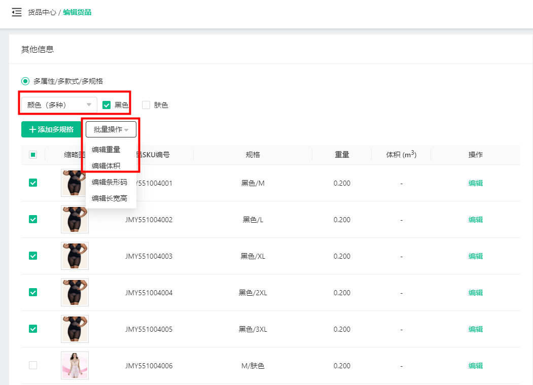 ERP货品管理新增新增批量「编辑重量」和「编辑体积」,可实现按SKU批量调整货品重量和体积,省时省力。