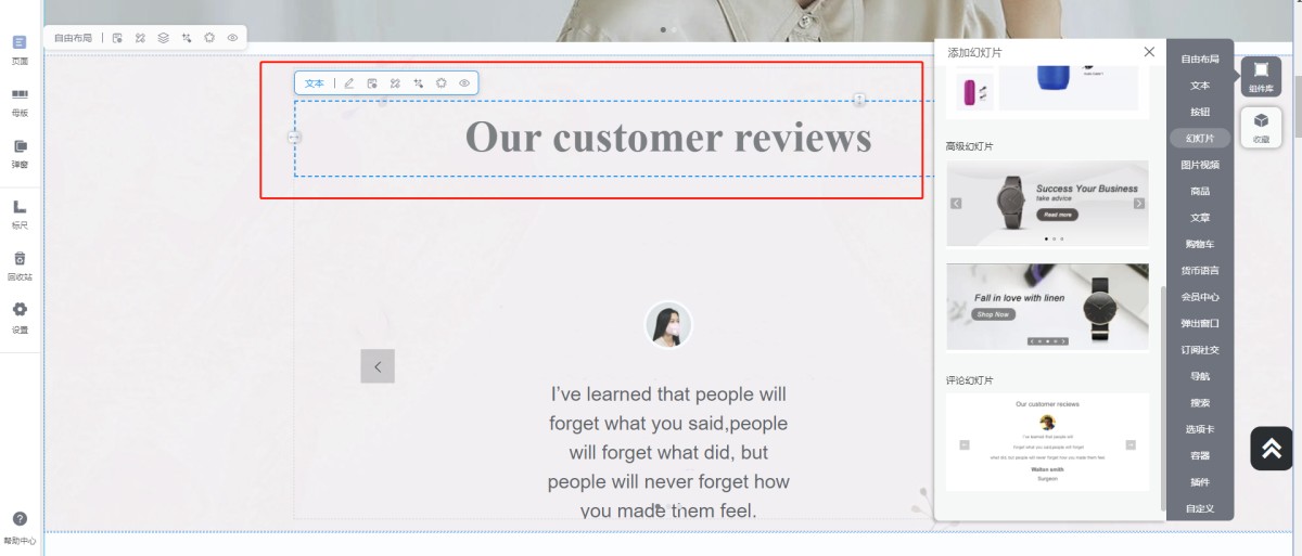 选中幻灯片上的文本或者按钮组件,点击文本或者按钮组件上的编辑,即可编辑幻灯片上的文本或按钮。然后保存预览效果。