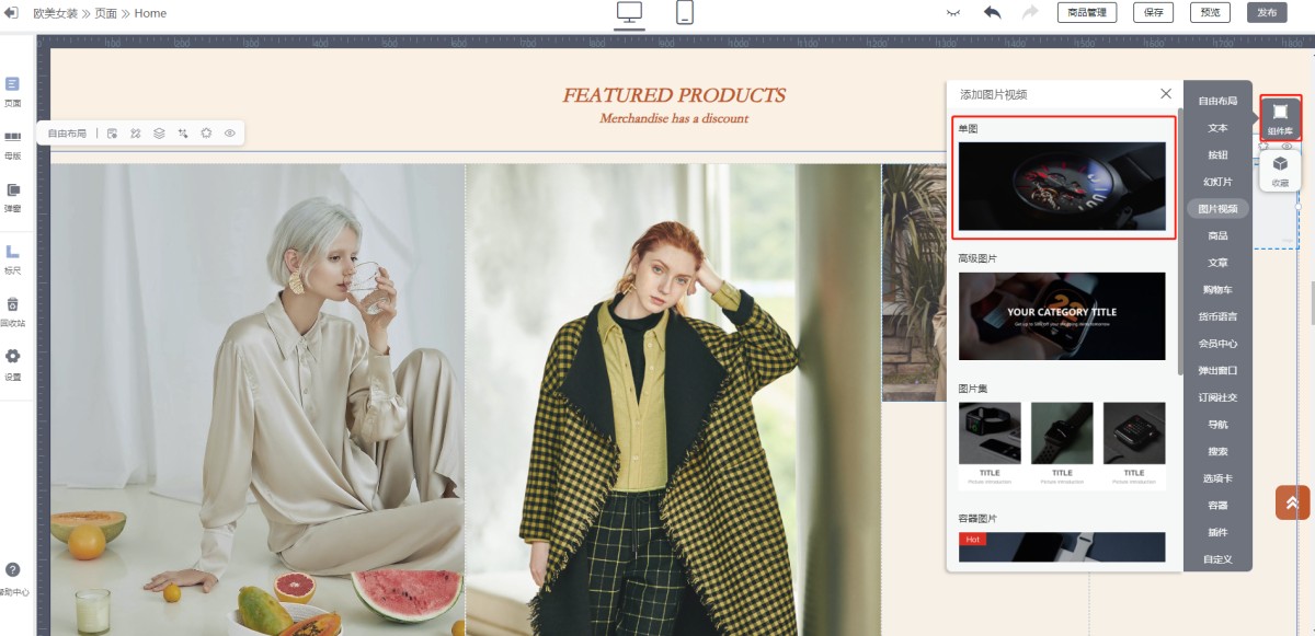 3.)在新的自由布局中拖入一个单图组件,点击单图组件的更改图片,插入一张图片。