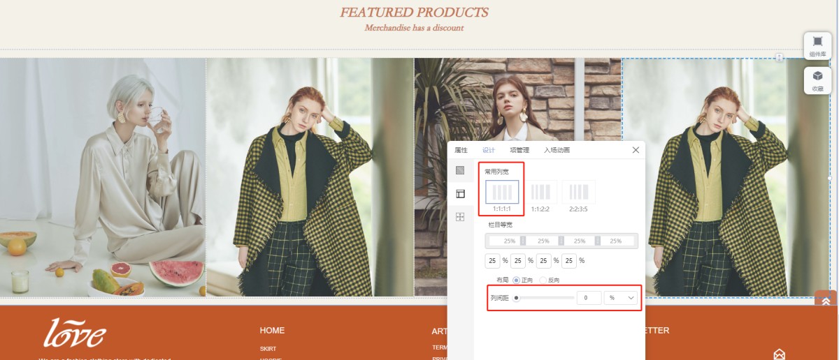 4)图片插入后,点击自由布局设计面板中的设计,调整自由布局的列宽,列间距或图片的大小。然后保存预览效果。