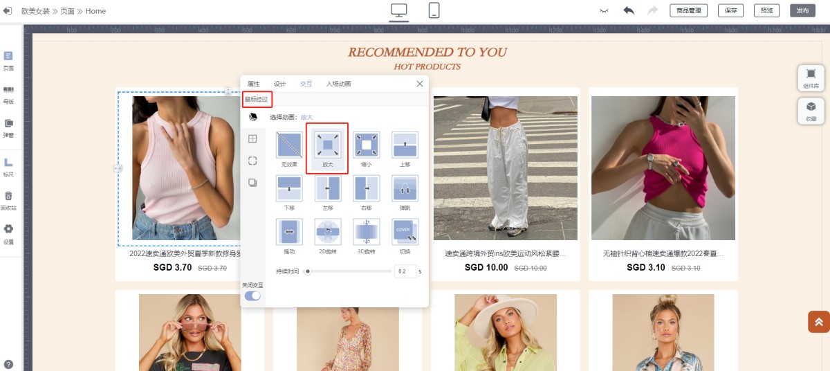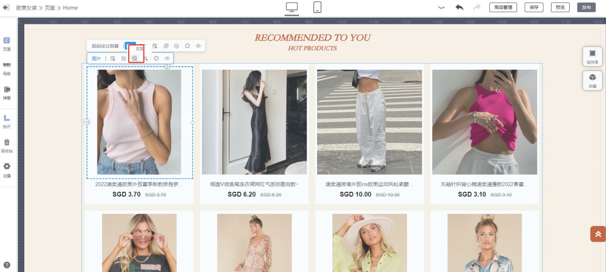 A:点击商品列表中的第一张图片,会出现图片的设计面板,点击交互