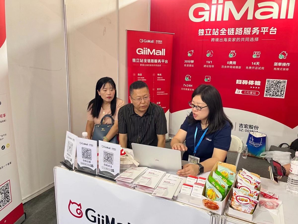 展位现场人头攒动,GiiMall工作人员不断向前来咨询的嘉宾分发产品手册,耐心听取嘉宾的问题并分析作答,详细讲解了GiiMall的业务范围和服务优势,并提供专业的独立站建站、投流、运营等方面的建议。