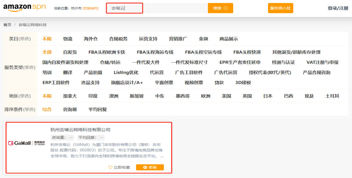进入亚马逊SPN网页版,在搜索栏搜索“吉喵云”找到我们。