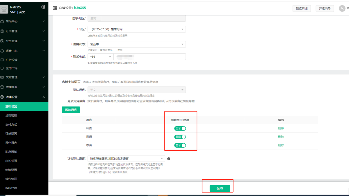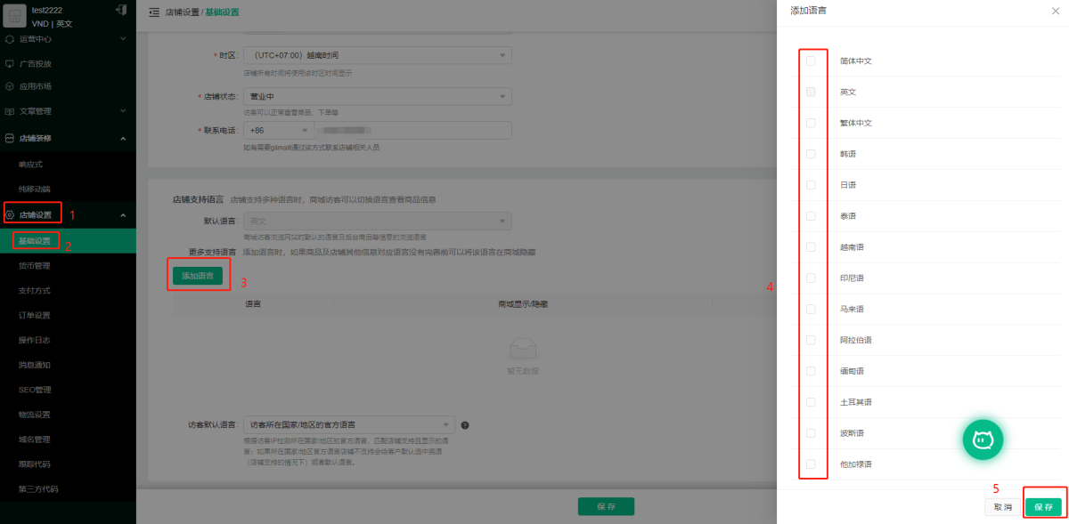 A: 1) In the backend of the merchant, click [Store Settings] - [Basic Settings], click [Add Language] under the supported languages of the store, select the target language (multiple choices), and click Save.